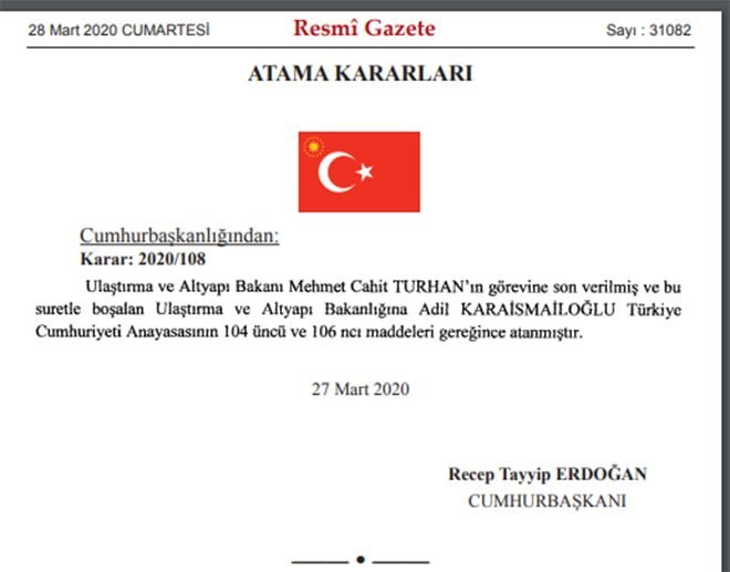 Cumhurbaşkanı Erdoğan, Ulaştırma Bakanı Cahit Turhan’ın görevine son verdi. Yerine Adil Karaismailoğlu atandı. Karaismailoğlu, Bakanlıkta bakan yardımcısı olarak görev yapıyordu.