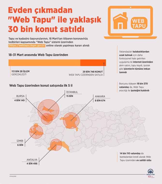 Çevre ve Şehircilik Bakanlığına bağlı Tapu ve Kadastro Genel Müdürlüğünce yeni tip Koronavirüs tedbirleri kapsamında, 18 Mart itibarıyla tapu işlemlerinin Web Tapu üzerinden de yapılmaya başlanmasıyla vatandaşlar, evlerinden çıkmadan bugüne kadar 113 bin işlem yaptı. Bu süre içerisinde yaklaşık 30 bin konut online olarak satıldı.