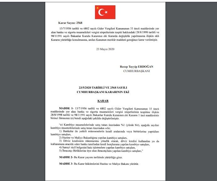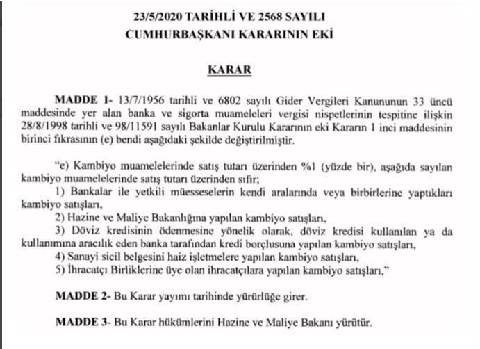 Kambiyo muamelelerinde döviz satış tutarı üzerinden yüzde 1 vergi alınması kararı AKP’li Cumhurbaşkanı Recep tayyip Erdoğan’ın imzasıyla Resmi gazetede yayımlandı. Altın ve döviz alış ve satışında uygulanan vergi, 5 kat artırılarak binde 2’den yüzde 1 düzeyine yükseltildi. Karar, ‘Serbest piyasa ekonomisinden uzaklaşma’ olarak yorumlandı.