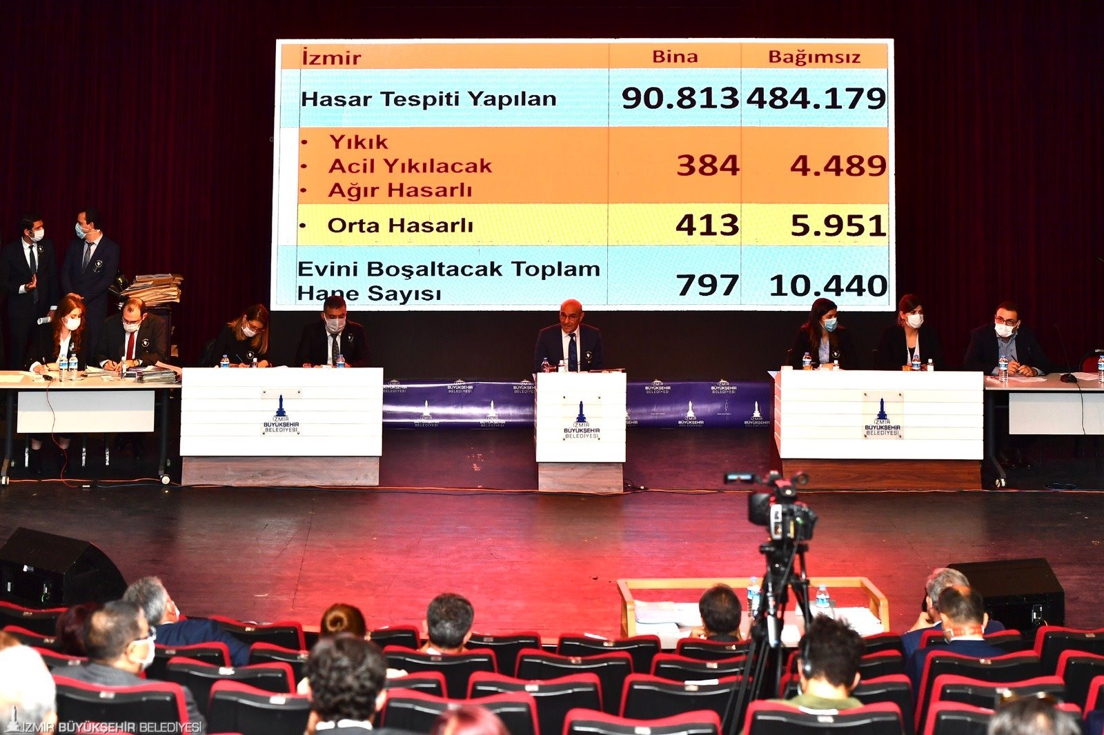 İzmir Büyükşehir Belediye Meclisi’nin Kasım ayı toplantısı birinci birleşimi İsmet İnönü Sanat Merkezi’nde depremde hayatını kaybeden 115 kişinin anısına bir dakikalık saygı duruşu ile başladı. İzmir Büyükşehir Belediye Başkanı Tunç Soyer, meclis üyelerine deprem sonrası yapılan çalışmalar hakkında bilgi verdi. Soyer, sadece evi yıkılmış ya da ya ağır hasar görenlere değil, orta hasarlı binalarda oturan ancak bugün oturamayacak durumda olanlara da destek verme kararı aldıklarını bildirerek, “Bir Kira Bir Yuva kampanyamız kapsamında bağışlar 30 milyona ulaştı. Belediye bütçesinden aktaracağımız 30 milyon lira ile birlikte bu rakamı 60 milyona çıkaracağız” dedi.