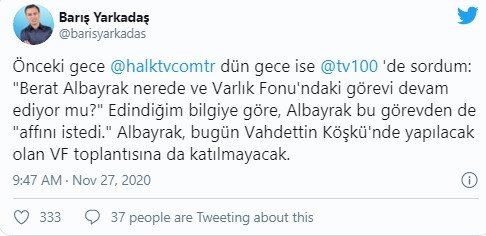 Eski CHP Milletvekili, gazeteci Barış Yarkadaş sosyal medyada yaptığı açıklamada, “Edindiğim bilgiye göre, Albayrak bu görevden de ‘affını istedi.’ Albayrak, bugün Vahdettin Köşkü’nde yapılacak olan Varlık Fonu toplantısına da katılmayacak” dedi.