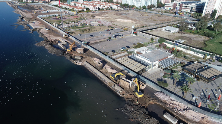 İzmir Büyükşehir Belediyesi Mavişehir’de özellikle kış aylarında deniz seviyesinin yükselmesiyle oluşan taşkınlara son verecek Kıyı Rehabilitasyon Projesi’ni hızla sürdürüyor. Mavişehir’lilerin sıkıntılarını sona erdirecek 32,5 milyon liralık yatırımın iş bitim tarihinden önce tamamlanması için ekipler yoğun tempoda çalışırken 2 bin 88 metrelik su içi betonun 500 metresinin tamamlandığı bildirildi.